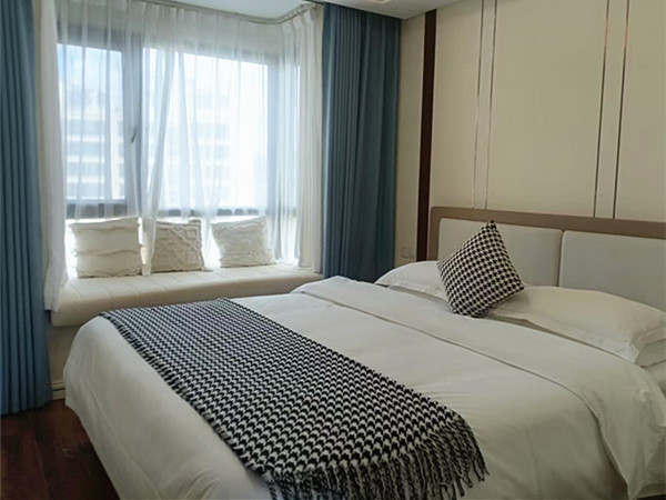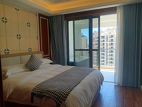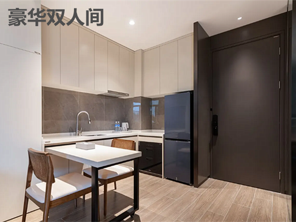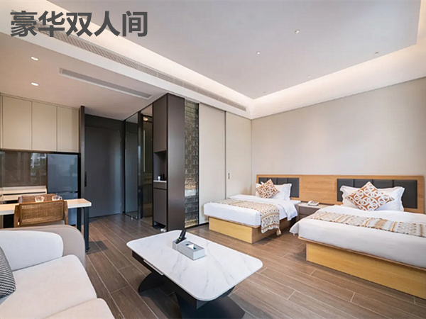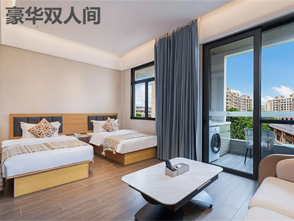 豪华双人间配置:面积60平米,两张1.2米单人床,均配电视、空调、冰箱、洗衣机、衣柜、茶几、餐桌、灶台、吹风机、拖鞋、24小时热水、WiFi、有独立阳台、干湿分离卫生间。