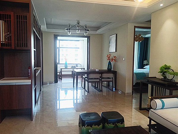 豪华两居室配置:面积98平米,两房一厅,主卧一张1.8米大床、次卧一张1.5米大床,均配电视、空调、冰箱、洗衣机、衣柜、茶室、餐桌、厨房、吹风机、拖鞋、24小时热水、WiFi、有独立阳台、浴缸、干湿分离卫生间。
