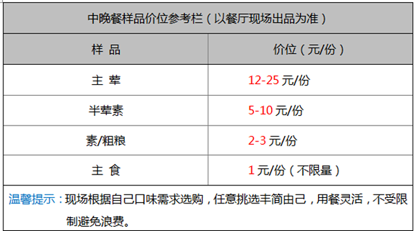 中晚晚餐:15个品种以上,现场根据自己需求自选自点形式购买。适合满足各年龄段以及各方客户的饮食需求和习惯。