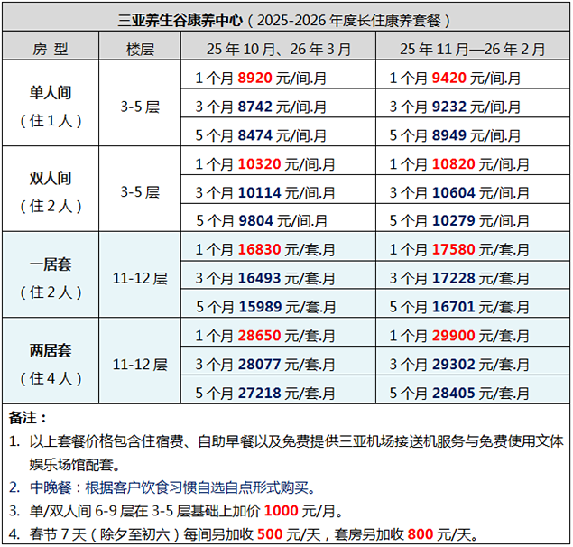 三亚养生谷康养中心2025-2026年度套餐价格(8.29更新)
